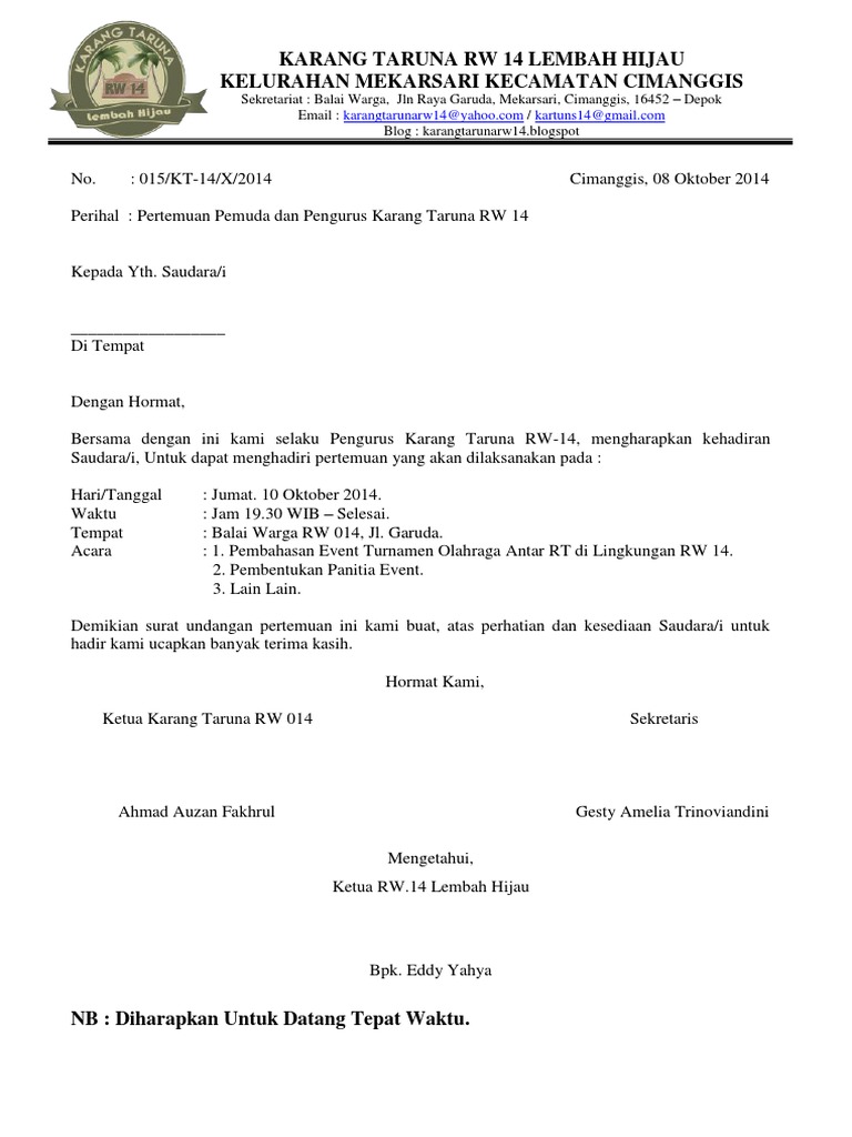 Mengingat bahwa teknologi komunikasi saat ini. Yang paling mudah dan sering ditemukan adalah contoh surat undangan rapat resmi untuk mengajak karyawan atau pihak lain agar menghadiri sebuah rapat, sebaiknya menggunakan surat undangan resmi yang baik. Contoh surat undangan resmi paling lengkap, dikemas rapi dan menarik dengan menggunakan gaya bahasa yang enak dibaca, sehingga menciptakan rasa nyaman bagi demikian surat undangan ini kami sampaikan untuk anda, mengingat sangat pentingnya agenda acara ini, maka kami sangat. Contohnya saja kamu ingin mengikuti kegiatan budaya banyumas seperti pementasan kentongan. Isi surat undangan bisa jadi untuk surat resmi maupun tidak resmi. Undangan ini biasanya dipergunakan di perusahaan, organisasi, instansi. Maka, pada kesempatan kali ini kita akan membahas terkait. Lalu, untuk mempererat tali persaudaraan dan kekompakan dalam melestarikan budaya, sebuah komunitas akan membuat acara tertentu yang bertemakan budaya kamu. Dokumentasi surat masuk dan keluar harus dilakukan dengan rapi supaya mudah melacak kegiatan organisasi atau instansi tersebut. Surat undangan resmi merupakan surat undangan yang dibuat oleh instansi atau perusahaan untuk kegiatan yang formal seperti undangan rapat membuat surat undangan tidaklah sulit karena format penulisannya sama dengan membuat surat izin namun ada beberapa hal yang perlu anda perhatikan. Nama serta alamat pihak yang dituju, di bagian ini cantumkan nama dan alamat pihak yang akan kamu undang dalam kegiatan secara lengkap dan jelas. Surat undangan resmi pada berbagai kegiatan yang resmi sebagai manfaat dan referensi membuat surat undangan resmi yang profesional. Dan untuk memastikan kehadiran setiap orang, maka berbagai pihak seringkali menggunakan surat undangan resmi.
