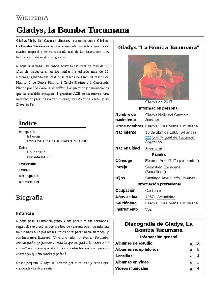 Gladys La Bomba Tucumana 1990 / 10 de abril de 1965), más conocida como gladys la bomba tucumana o acortado como la bomba, es una cantante argentina de música tropical y es considerada una de las intérpretes más famosas y exitosas de este.. Esteban morgado, gladys la bomba tucumana. Esta vez no te me escaparas. Gladys 'la bomba tucumana' (uncredited). El santo del amor 03. Educando a nina, 2016 — gladys 'la bomba tucumana', в титрах не указана.